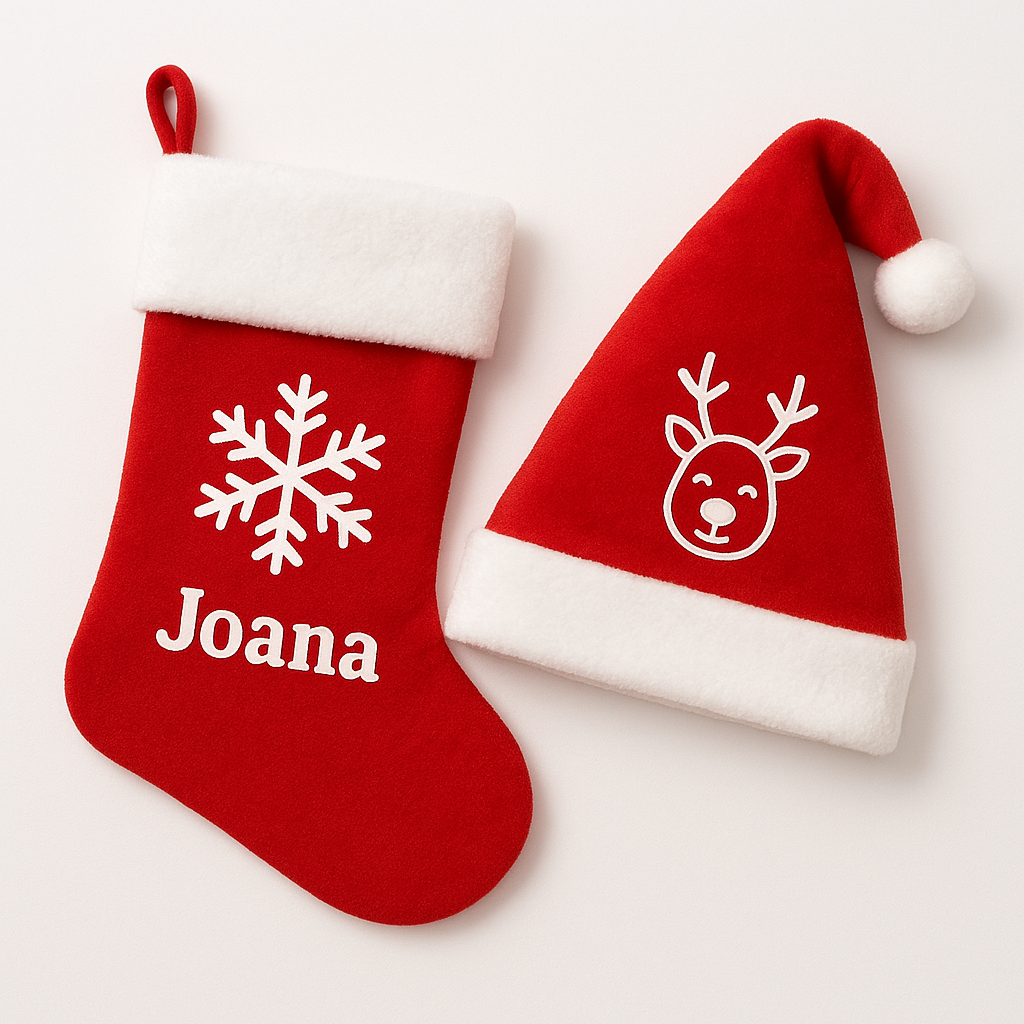 Meia e Gorro de Natal personalizados. Coloque o nome, o desenho animado, foto da família…o que quiser!