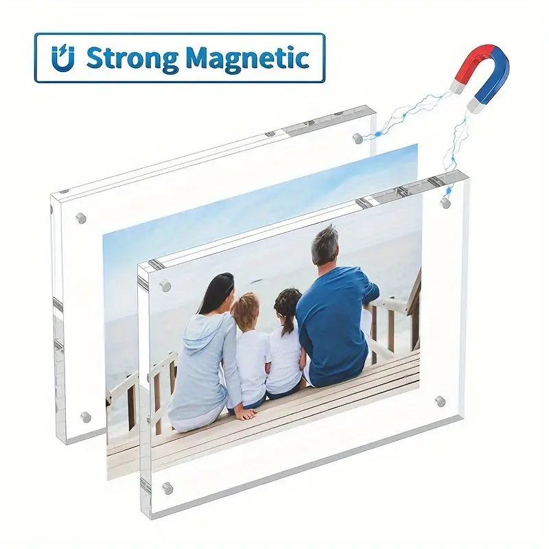 O nosso acrílico é o conjunto de dois acrílicos com iman em cada canto. Resistente e com espessura de 1cm.