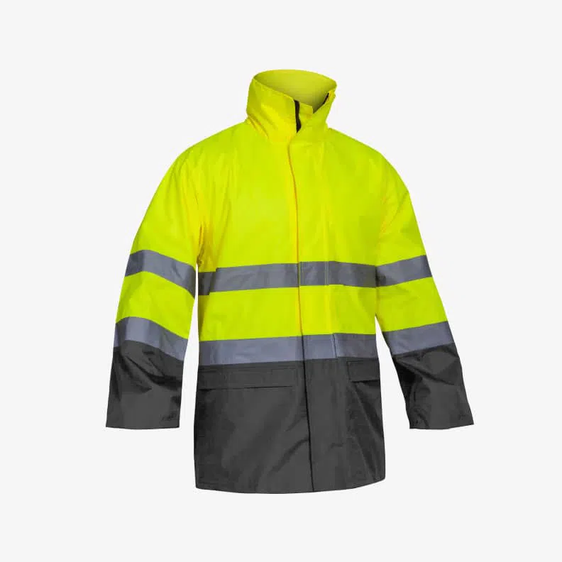 Fato Impermeável e de Alta Visibilidade composto com capuz, punhos e bolsos laterais. Composto por fitas refletoras com uma largura de 5 cm costura.
