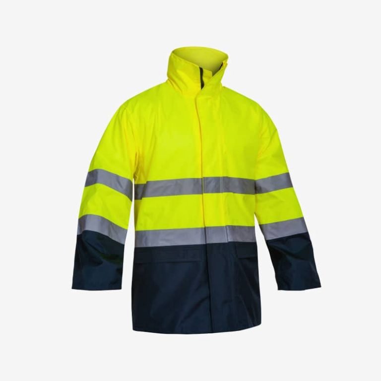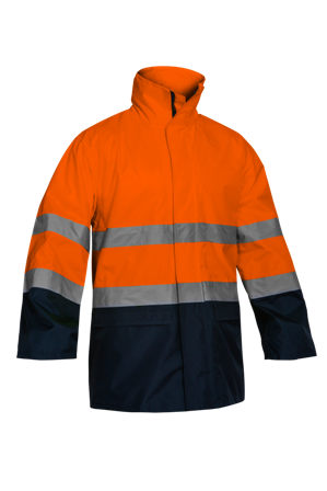 Casaco de alta visibilidade confecionados em tecido com várias cores. Laranja fluorescente / azul marinho.