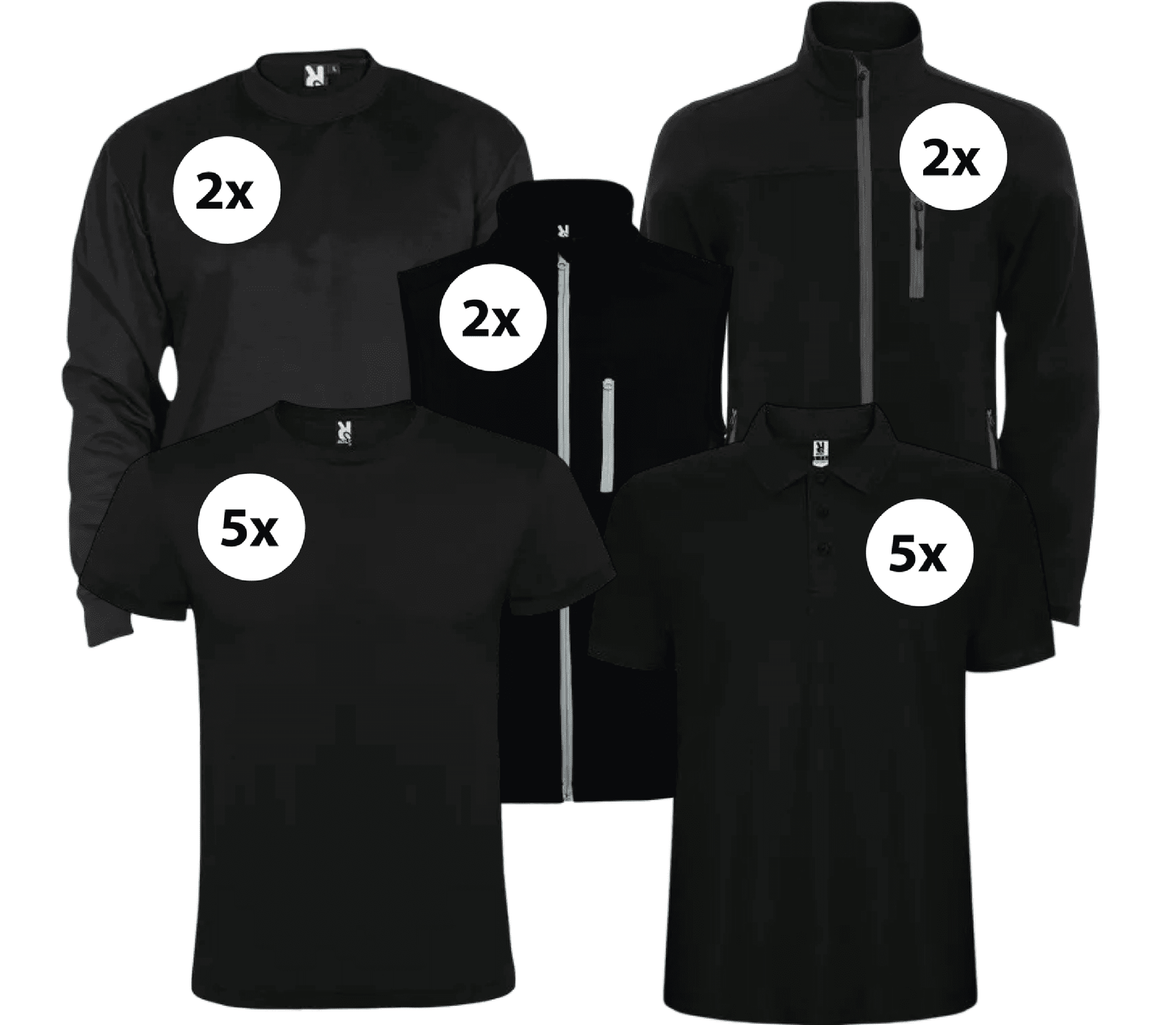 Este pack oferece 2 camisolas, 5 t-shirts, 5 pólos de manga curta, 2 coletes e 2 casacos soft shell. Tudo personalizado ao seu gosto.