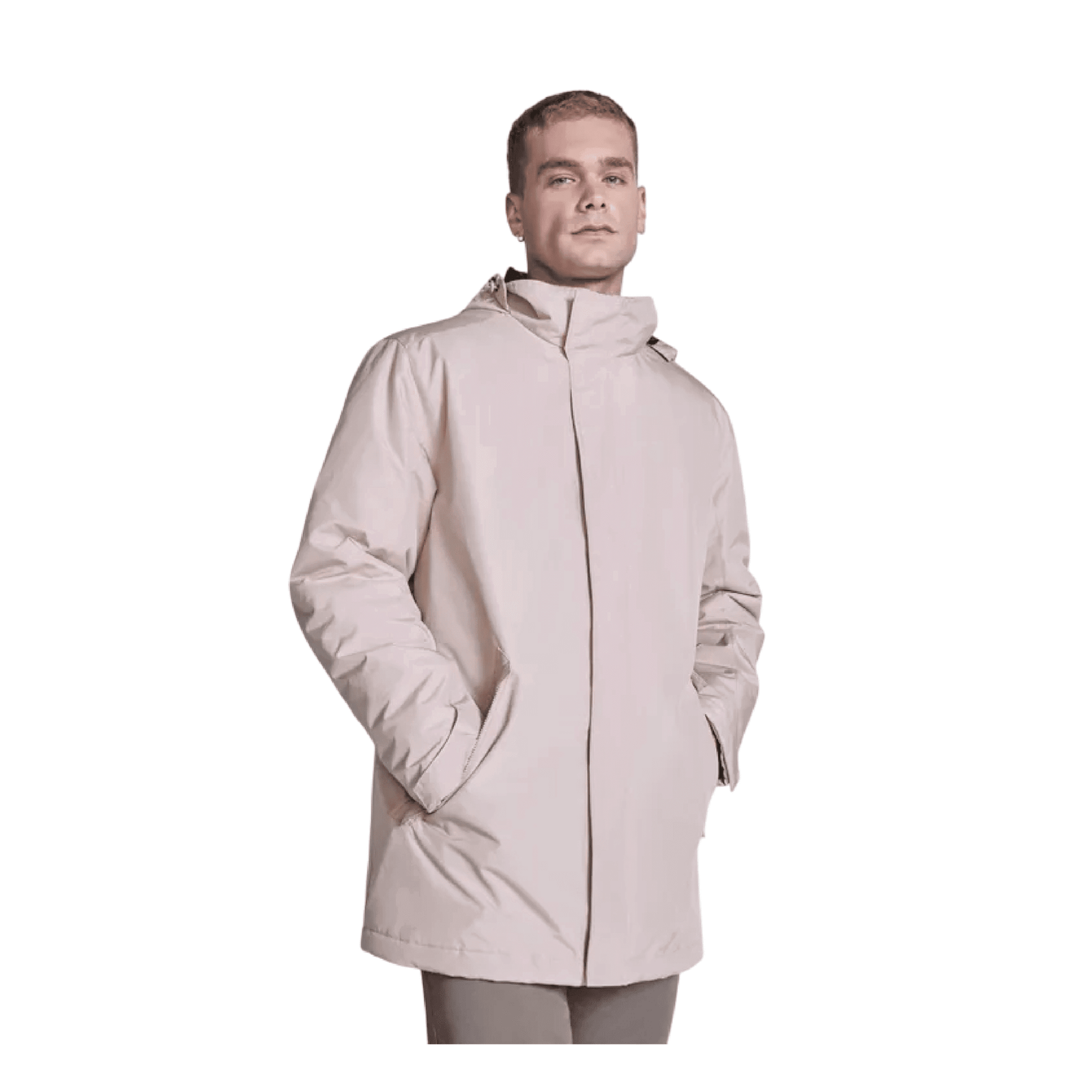 Bolsos laterais e interior. Acolchoado, feita de tecido impermeável. Gola alta com capuz dobrável e fecho de velcro.